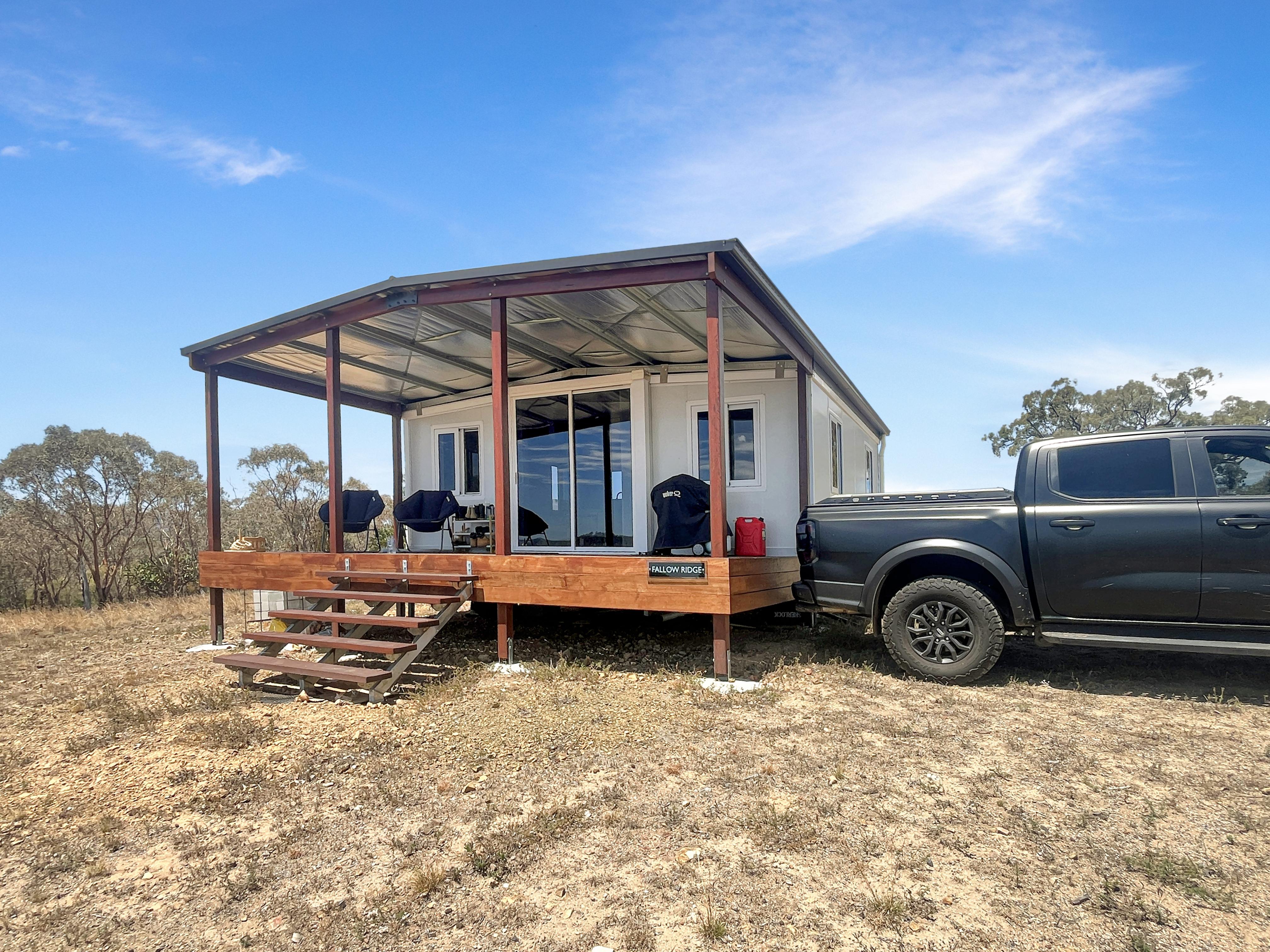 A custom-built timber deck wraps around the home, complete with wide stairs and a bespoke roof structure that protects the dwelling from the elements, insulates the home, while maximising rainwater collection for the tank. From this elevated vantage point, the sunset views are nothing short of spectacular, and the sweeping valley outlook is breathtaking at any time of day.